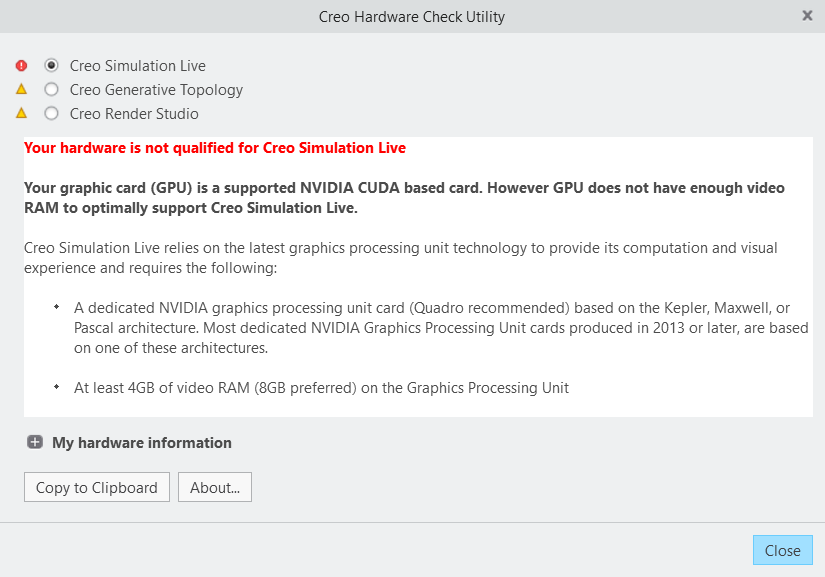 Creo Simulation Live sử dụng Graphics Processing Unit (GPU) hỗ trợ NVIDIA CUDA để thực hiện các phép tính và giải bài toán mô phỏng. Bạn có thể sử dụng tiện ích PTC Hardware Check để xác minh xem hệ thống của mình có đáp ứng các yêu cầu phần cứng cần thiết để sử dụng Creo Simulation Live hay không.