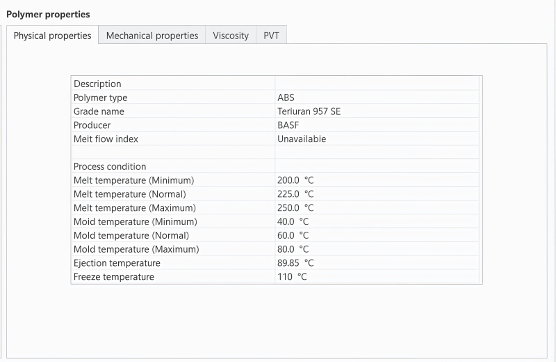 Mold Analysis Extension cung cấp thư viện vật liệu phong phú để bạn lựa chọn. Bạn có thể chọn loại vật liệu, nhà sản xuất, và cấp độ (grade) tương ứng. Các đặc tính polymer của từng vật liệu đã được định nghĩa sẵn trong thư viện. Ngoài ra, bạn cũng có thể tạo vật liệu tùy chỉnh và tự thiết lập các thông số đặc trưng cho vật liệu đó.